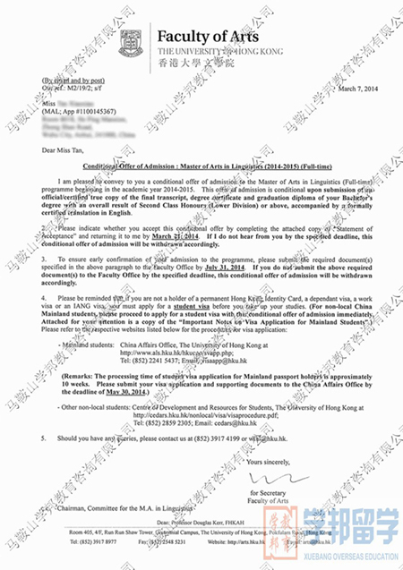 香港大學(xué)語言學(xué)專業(yè)研究生錄取通知書